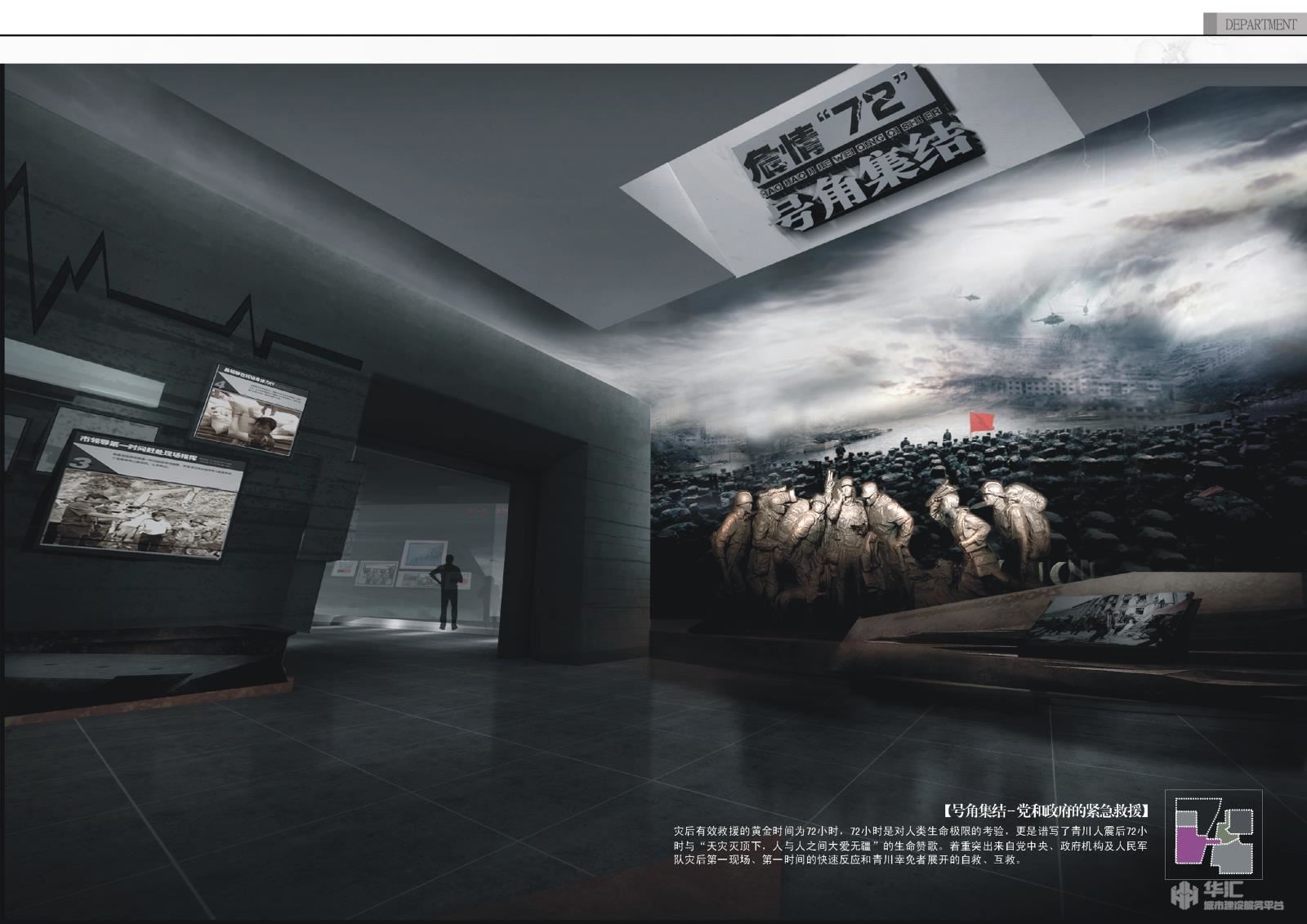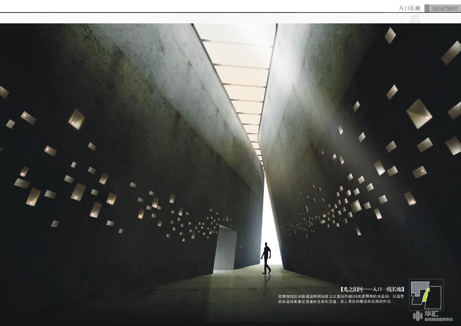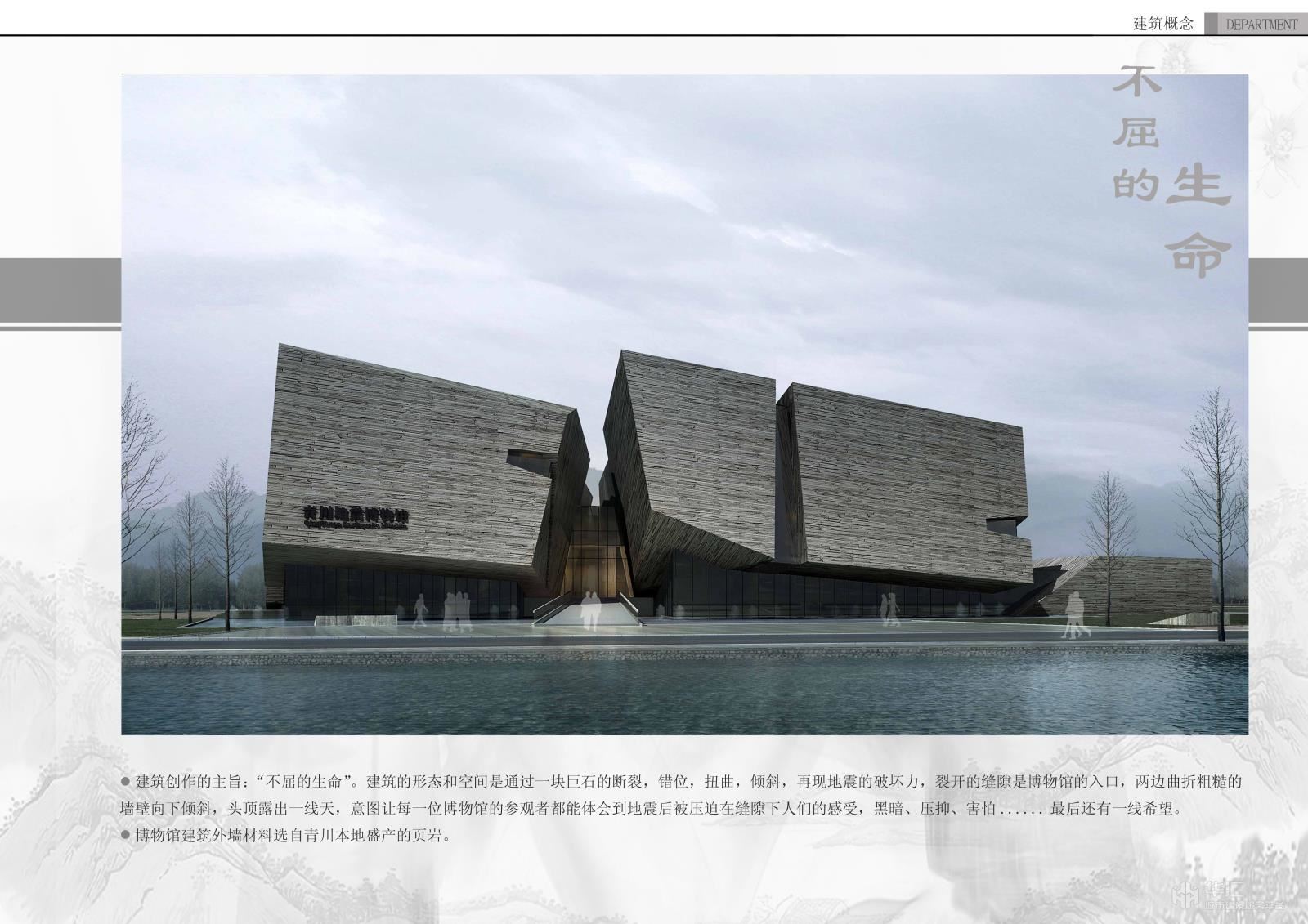 建筑的形態(tài)和空間是通過一塊巨石的斷裂, 錯(cuò)位,扭曲,傾斜,再現(xiàn)地震的破壞力,裂開的縫隙是博物館的入口,兩邊曲折粗糙的。墻壁向下傾斜,頭頂露出線天,意圖讓每一-位博物館的參觀者都能體會(huì)到地震后被壓迫在縫隙下人們的感受,黑暗、壓抑、害.....最后還有線希望。博物館建筑外墻材料選自青川本地盛產(chǎn)的頁巖。