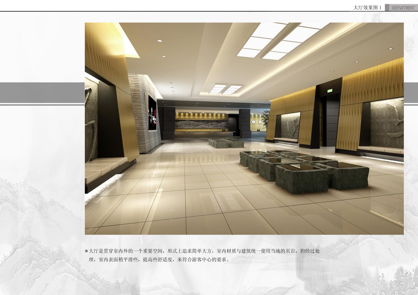 大廳是貫穿室內(nèi)外的一個(gè)重要空間,形式上追求簡(jiǎn)單大方,室內(nèi)材質(zhì)與建筑統(tǒng)一使用當(dāng)?shù)氐捻搸r,但經(jīng)過處理,室內(nèi)表面稍平滑些,提高些舒適度,來符合游客中心的要求。