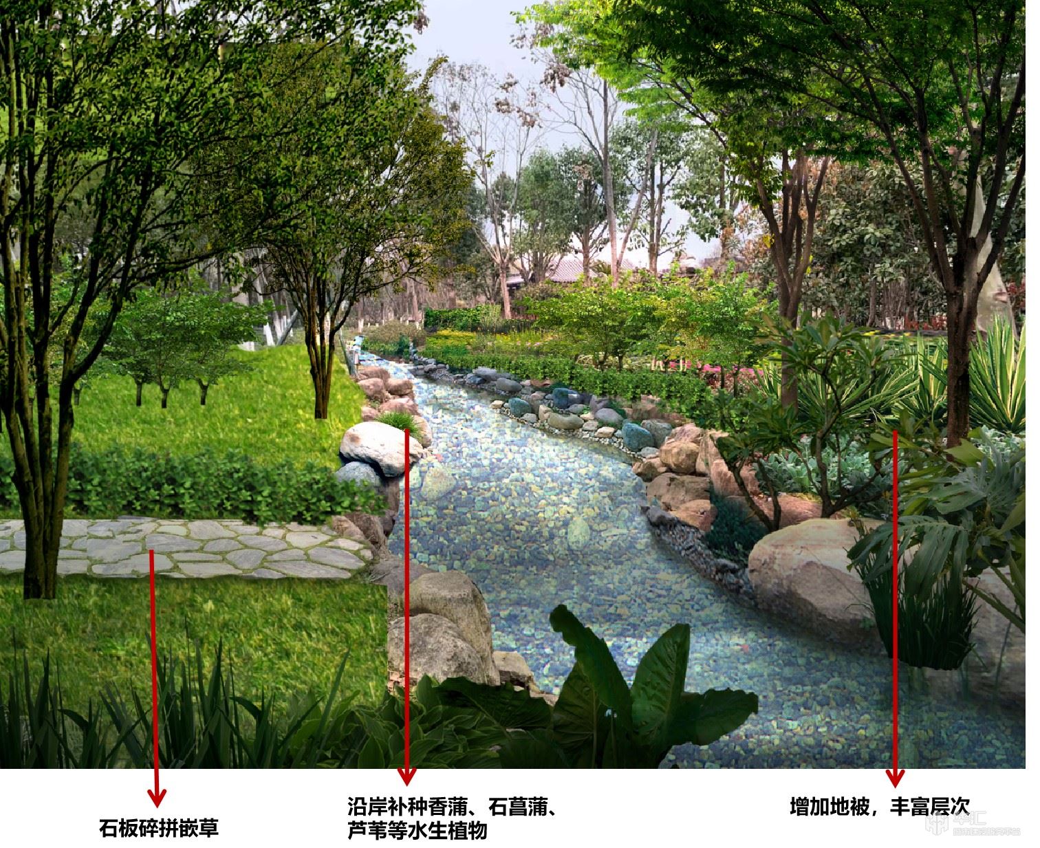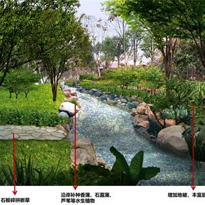 3)瑞豐商學(xué)院西南側(cè):豎向不協(xié)調(diào),導(dǎo)致局部水流不暢、苔蘚雜草叢生,兩岸植被缺失,色彩層次不夠豐富。