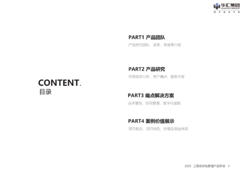 PART1 產(chǎn)品團(tuán)隊 產(chǎn)品研究團(tuán)隊、成果、榮譽(yù)等介紹 PART2 產(chǎn)品研究 市場現(xiàn)狀分析、客戶痛點(diǎn)、服務(wù)內(nèi)容 CONTENT. 目錄 PART3 痛點(diǎn)解決方案 成本管控、協(xié)同管理、數(shù)字化賦能 PART4 案例價值展示 項目概況、項目特色、價值及效益體現(xiàn) 2025 工程總承包管理產(chǎn)品手冊 3